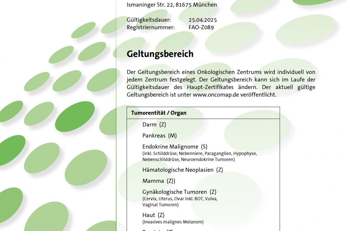 Die Zertifizierungsstelle der Deutschen Krebsgesellschaft e.V. OnkoZert bescheinigt, dass das Onkologische Zentrum im CCCM TUM am Klinikum rechts der Isar der Technischen Universität München (TUM), Ismaninger Straße 22, 81675 München, vertreten durch Frau Univ.-Prof. Dr. med. Stefanie Combs, die durch die Deutsche Krebsgesellschaft festgelegten "Fachlichen Anforderungen für Onkologische Zentren (FAO)" definierten Qualitätskriterien erfüllt.