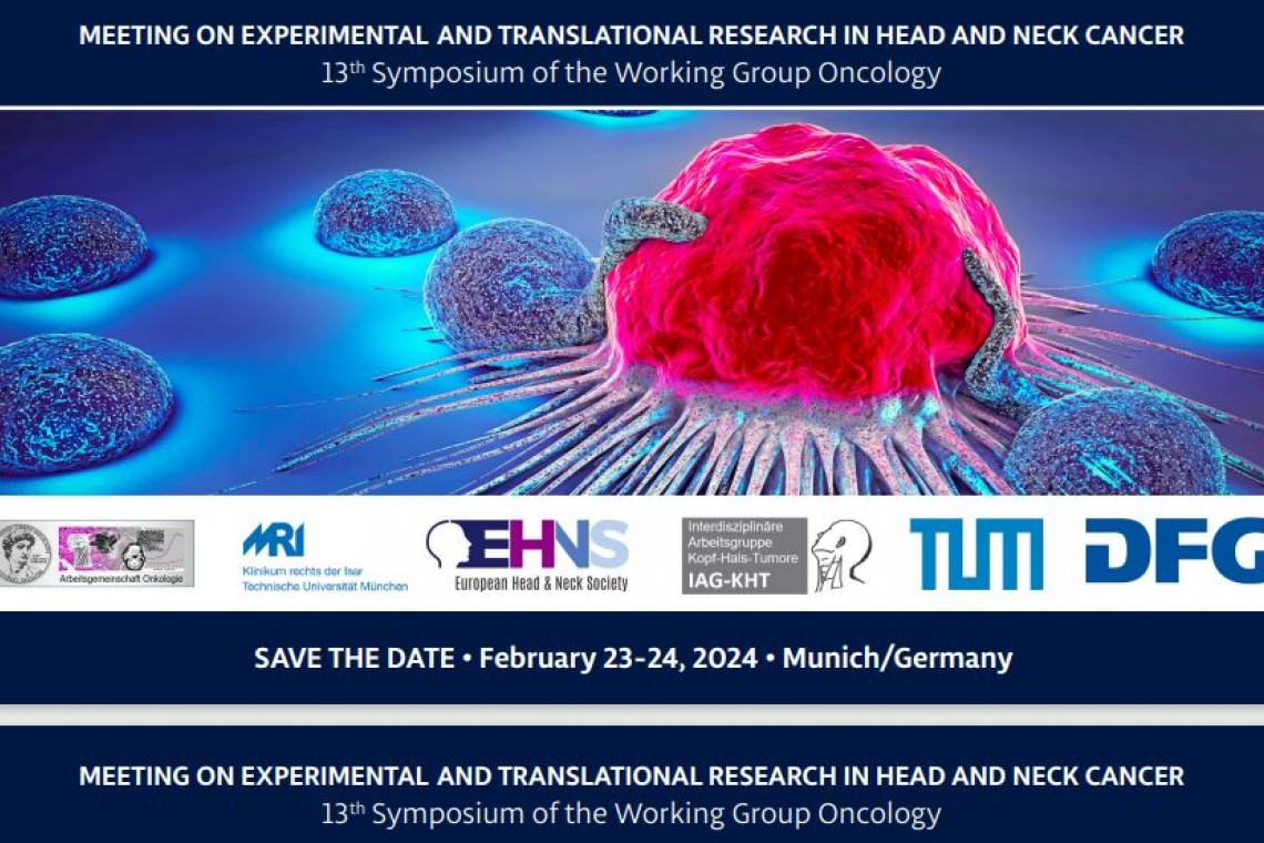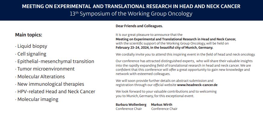 It is our great pleasure to announce that the Meeting on Experimental and Translational Research in Head and Neck Cancer, with the scientific support of the Working Group Oncology, will be held on February 23-24, 2024, in the beautiful city of Munich, Germany.