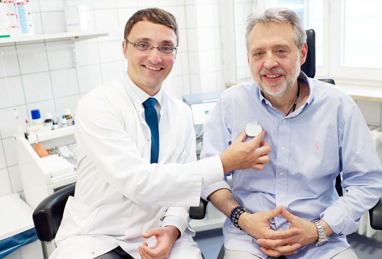 Ein Zungenschrittmacher kann vor allem für Betroffene, die mit einer Maskentherapie (CPAP) nicht zurecht kommen, sehr hilfreich sein. Mit Hilfe dieser Neurostimulation wird der Unterzungennerv während des Schlafs gezielt mit feinen elektrischen Impulsen stimuliert, sodass die Muskulatur zum Offenhalten der oberen Atemwege aktiviert wird. Damit wird der Rachenbereich vor dem Zusammenfallen geschützt und die Luft kann wieder ungehindert in die Lunge strömen. Gerne finden wir in einem persönlichen Beratungsgespräch heraus, ob Sie für diese innovative Therapie geeignet sind. Vereinbaren Sie einfach einen Termin in unserer Zungenschrittmacher-Sprechstunde.